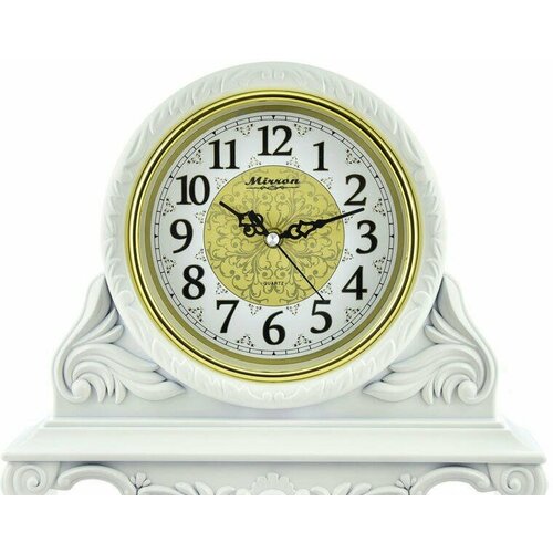 Большие настольные кварцевые часы MIRRON M4001C КБ/Металлический циферблат/Коричневый цвет корпуса/Часы с узорами/Белый (светлый) циферблат/Арабские цифры/Каминные часы