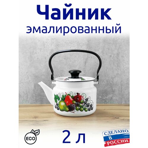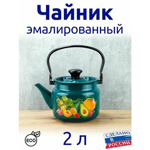 Чайник эмалированный 2 л бирюзовый, с рисунком фрукты, пищевой