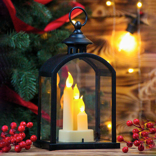 Светильник новогодний декоративный "Фонарь со свечками" 29см, светящийся, USB, черный