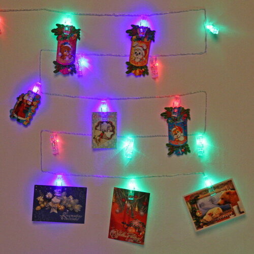 Преимущества:1. Простой и удобный способ украсить любое помещение.2. Яркие светодиоды обеспечивают равномерное и яркое освещение.3. Возможность прикреплять различные предметы благодаря удобным зажимам-прищепкам.4. Безопасна для использования, имеет класс защиты IP67.5. Работает от сети, не
