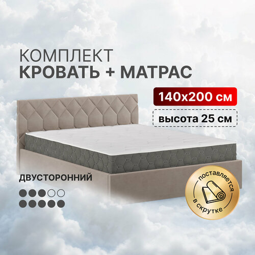 Кровать с матрасом высотой 25см, кровать 140х200 c подъемным механизмом и местом для хранения Техас светло-серый