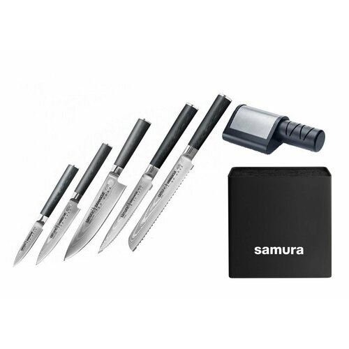 SD-0255МБД набор из 5-ТИ ножей SAMURA DAMASCUS овощного, универсального, шефа, для томатов, для хлеба и магнитного держателя из белого пластика