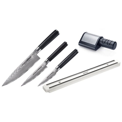 SD-0233МБДЭТ набор из 3 кухонных ножей SAMURA DAMASCUS овощной, универсальный, ШЕФ, магнитный держатель и электрическая точилка