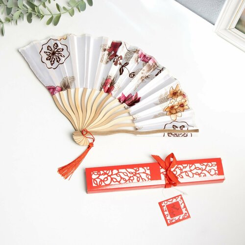 Веер бамбук, текстиль h=21 см изгиб, с кистью "Цветы" в коробке, бело-красный