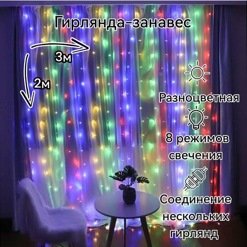 Светодиодная новогодняя гирлянда "Занавес-штора", 3х2 м Разноцветная