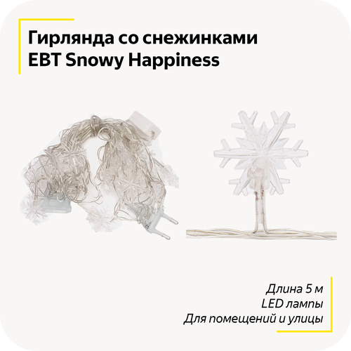 Гирлянда новогодняя с фигурками снежинок EBT Snowy Happiness / Длина 5 метров / Для помещения и улицы / С LED лампами (светодиодами)