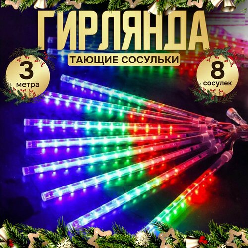 Электрогирлянда уличная новогодняя "Тающая сосулька" цветная 3 метра(8 сосулек по 30 см)