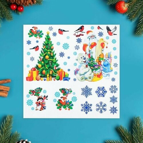 Набор наклеек на окна Новогодний ёлочка, снегири, Дед Мороз, 36 х 36 см/ по 1 шт шт