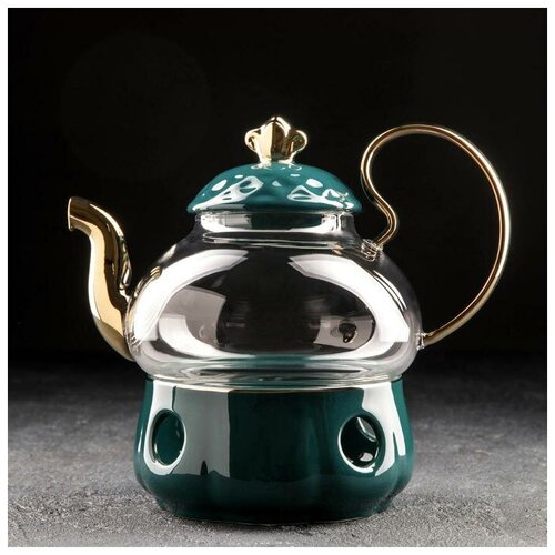 Чайник стеклянный заварочный с металлическим ситом и подставкой для подогрева «Элегия», 600 мл, цвет изумрудный/золотой