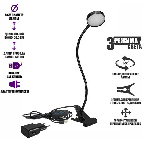 Гибкая настольная лампа SL-06bda на прищепке для горизонтального и вертикального крепления с адаптером питания, чёрная