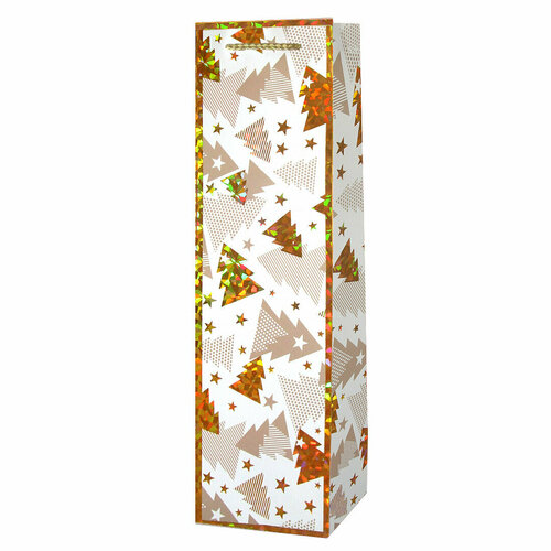 Пакет подарочный для вина, Новогодний узор (елочки), Металлик, 38*11*11 см, 1 шт.