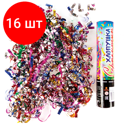 Комплект 16 шт, Хлопушка пневматическая ПатиБум "Серпантин", 20см, в металлической тубе, фольга