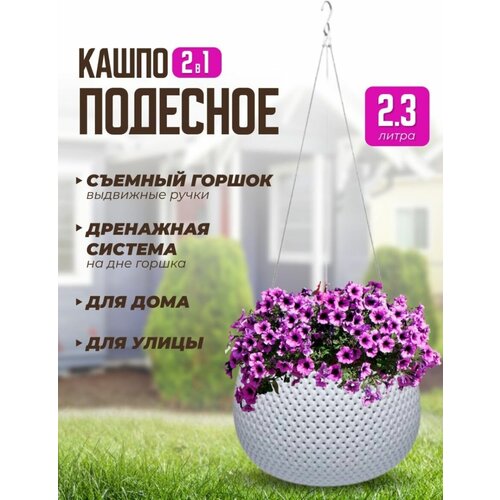 Кашпо подвесное для цветов 2.3 литра . горшок для цветов со вставкой настольный , подвесной . Цвет -белый.
