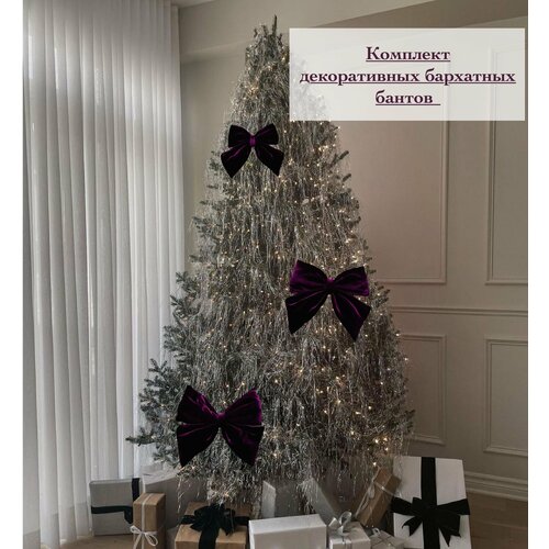 Комплект фиолетовых декоративных бархатных бантов с серебром, размер L