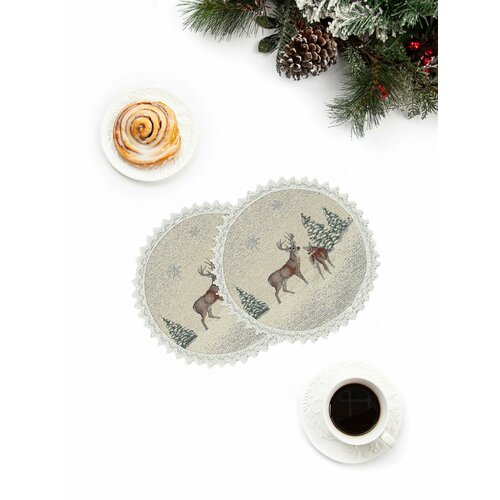 Комплект декоративных салфеток из гобелена производства Испании. Диаметр салфетки: 30 см Мы закупаем ткань для салфеток на двух лучших ткацких фабриках Испании, высокий уровень качества которых подтвержден сертификатом качества OEKO-TEX Standard 100 и многолетней безупречной работой на Европейском рынке. Затем специалисты нашего швейного производства бережно отшивают салфетки, превращая их в готовые изделия, которые уже более десяти лет радуют наших покупателей. Состав ткани: полиэстер 75%, хлопок 22%, акрил 3%. Край украшен тесьмой. Размеры изделия могут отличаться от заявленных +/- 3 сантиметра. Машинная стирка при 30 градусах на деликатном режиме. При стирке не смешивать с другими тканями. Гладить при средней температуре.