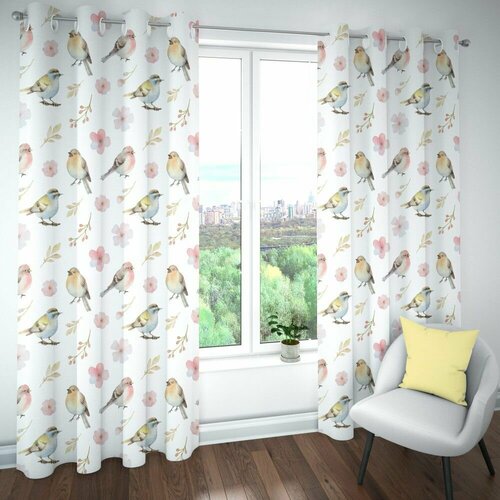 Комплект штор из блэкаута, Синички Акварель, 150/260 - 2 полотна