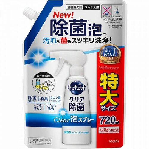Kao cucute clear спрей-пенка для для мытья посуды без губки, с лимонной кислотой и ароматом грейпфрута, мягкая упаковка, 720 мл
