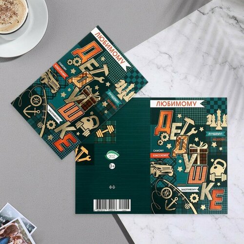 Открытка "Любимому дедушке!" удочка, шахматы, конгрев, тиснение, 12,5х19,4 см 10073811
