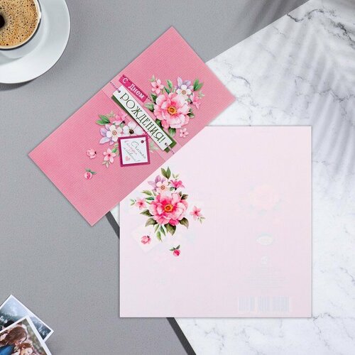 Открытка-евро "С Днём Рождения!" розовый фон, цветы, 21,5х21,5 см 9935167