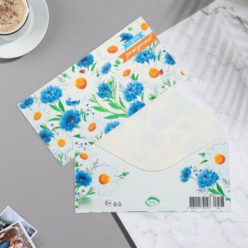 Конверт для денег "С Днём Рождения!" конгрев, глиттер, ромашки, васильки, 17х8 см 9895080