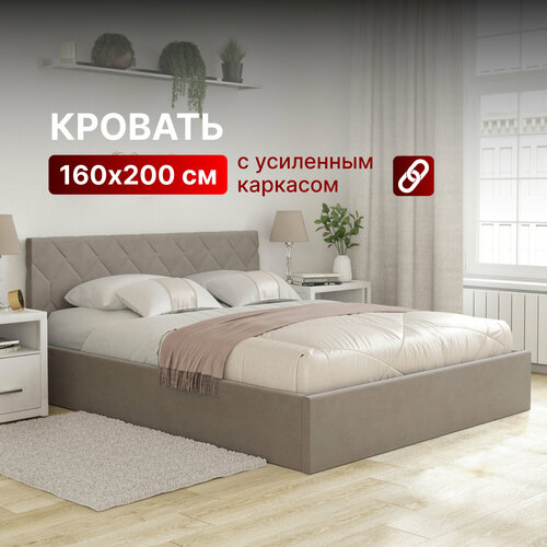 Кровать 140х200 с подъемным механизмом двуспальная Техас с ортопедическим основанием и ящиком для белья, мягкое изголовье, для спальни и дома, велюр с светло-бежевый