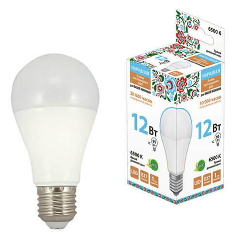 Лампа светодиодная E27, 12 Вт, 95 Вт, груша, 6500 К, свет холодный синий, TDM Electric, Народная