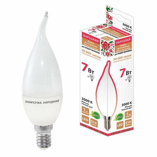 Лампа светодиодная E14, 7 Вт, 55 Вт, свеча на ветру, 3000 К, свет теплый белый, TDM Electric, Народная