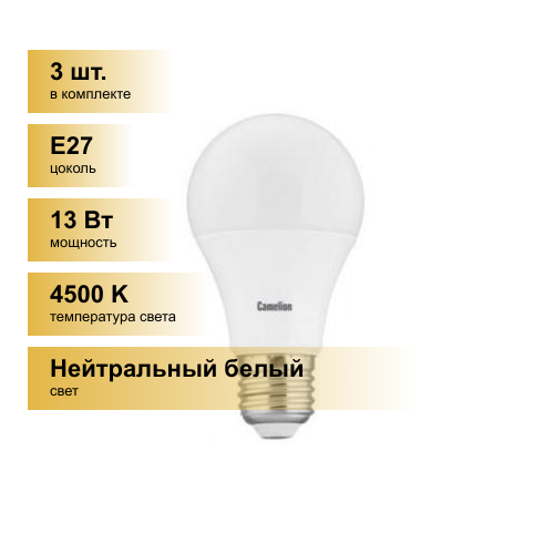 (3 шт.) Светодиодная лампочка Camelion ЛОН A60 E27 13W(1085lm 270гр.) 4500K 4K матов. 120x60 пластик LED13-A60/845/E27