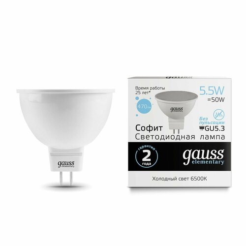 (10 шт)Лампа Gauss Elementary MR16 5.5W 470lm 6500К GU5.3 LED 1/10/100