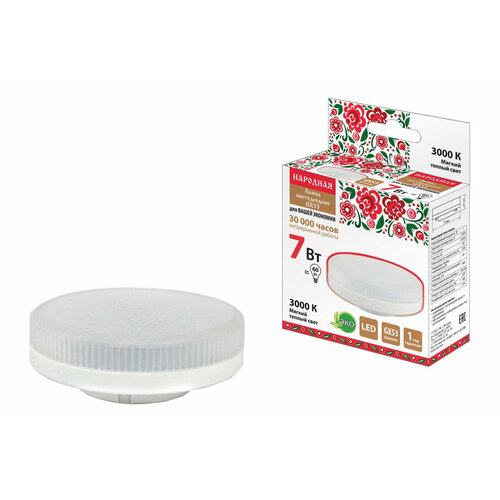 Лампа светодиодная GX53, 7 Вт, 60 Вт, таблетка, 3000 К, свет теплый белый, TDM Electric, Народная