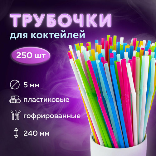 Одноразовые трубочки для напитков / коктейлей гофрированные, пластиковые 5 х 240 мм, цветные Комплект 250 штук, Laima, 608361
