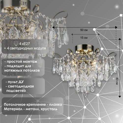 Люстра хрустальная Росток E1667/4+4 AB бронза/хрусталь 4х40W E27+4x3W LED ПДУ d500 h400