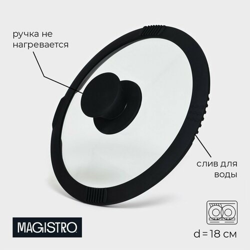 Крышка стеклянная, со сливом, с силиконовым ободком и ручкой Magistro, d=18 см, чёрная 1шт.