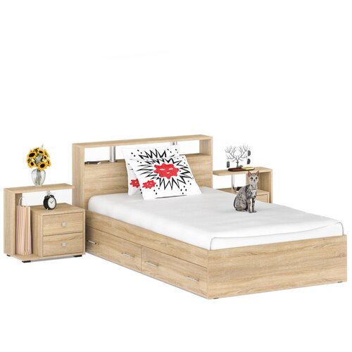 Кровать с ящиками 1200 с двумя тумбочками Камелия, цвет дуб сонома, ШхГхВ 236х217х78,2 см, спальное место 1200х2000 мм, без матраса, основание есть