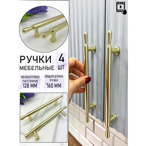 Ручка для мебели металлическая для шкафа золотая (128 мм), 4шт.