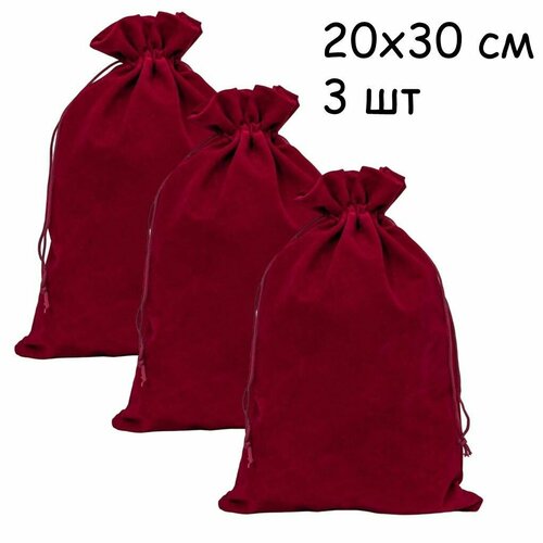 Мешочек подарочный бархатный бордовый 20х30 см для подарков, для хранения, комплект 3 шт.