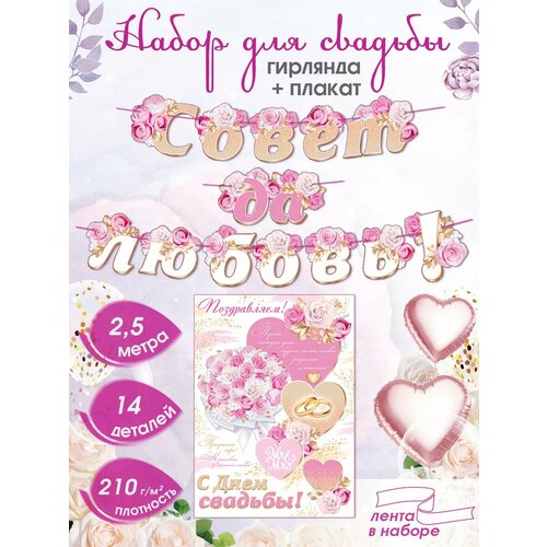 Гирлянда-растяжка бумажная на стену для украшения интерьера и фотозоны "Совет да любовь!", С Днем Свадьбы!