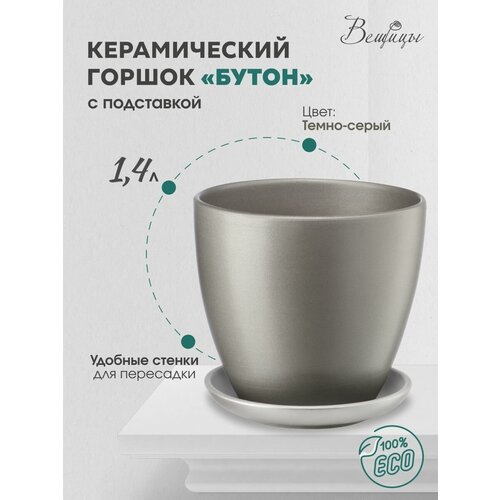 Кашпо Вещицы с поддоном Бутон, 1.4л, 13.5x13 см, 13.5x13.5x13 см, темно-серый