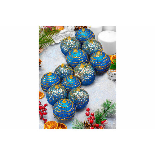 Набор 12 новогодних шаров Elan Gallery Золото на синем 9,5х9,5 см (6 штук) и 8х8 см (6 штук), синий
