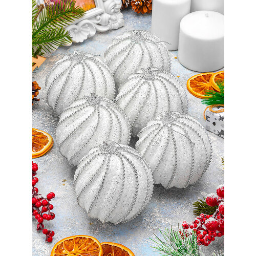серебристый, белыйНабор из 6-ти новогодних шаров украсит елку и привнесет праздничную атмосферу! Шары подойдут для использования в роли елочного украшения, интерьерного декора на стену, создания декоративных подвесных или настольных композиций. Еловые шарики мало весят: вы сможете подвесить их даже на самые высокие и тонкие веточки. Диаметр каждого шара 8 см. Имеется петля для подвешивания. Большие новогодние игрушки смогут стать настоящим украшением вашего дома и помогут ярко отпраздновать Новый Год или Рождество!