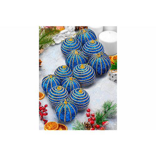 Набор 12 новогодних шаров Elan Gallery Полоски 9,5х9,5 см (6 штук) и 8х8 см (6 штук), синий