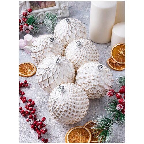 серебристый, белый, серебристыйНабор из 6-ти новогодних шаров украсит елку и привнесет праздничную атмосферу! Шары подойдут для использования в роли елочного украшения, интерьерного декора на стену, создания декоративных подвесных или настольных композиций. Еловые шарики мало весят: вы сможете подвесить их даже на самые высокие и тонкие веточки. Диаметр каждого шара 9,5 см. Имеется петля для подвешивания. Большие новогодние игрушки смогут стать настоящим украшением вашего дома и помогут ярко отпраздновать Новый Год или Рождество!