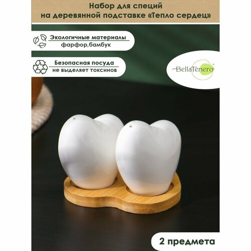 Набор для специй на деревянной подставке BellaTenero «Тепло сердец», 2 предмета: солонка 75 мл, перечница 75 мл