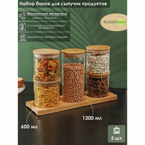 Набор банок стеклянных для сыпучих продуктов с бамбуковой крышкой BellaTenero «Эко», 600/1300 мл, 5 шт