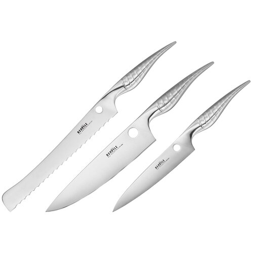 Пять самых востребованных ножа – универсальный, слайсер, обвалочный, Шеф, Сантоку. Тот самый минимум, который необходим любому повару. При помощи такой команды можно приготовить любое блюдо. Универсальный берёт на себя очистку, а также работает с продуктами небольших размеров, Слайсер прекрасно нарезает филе рыбы, мяса на тонкие ломтики, обвалку мяса от костей соответственно, берет на себя Обвалочный, Шеф предназначен для самых важных и трудных работ по кухне – разделке и нарезания рыбы, мяса, птицы, шинкования капусты, "вскрытия" и разделения на порции арбуза, Сантоку идеален для рубки мяса, зелени, овощей.