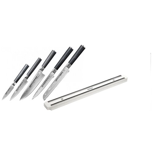 SD-0255МБД набор из 5-ТИ ножей SAMURA DAMASCUS овощного, универсального, шефа, для томатов, для хлеба и магнитного держателя из белого пластика