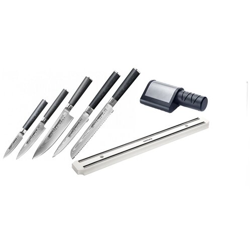 SD-0255МБДЭТ набор из 5-ТИ ножей SAMURA DAMASCUS овощного, универсального, шефа, для томатов, для хлеба, держателя и электроточилки