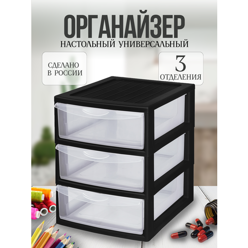 Настольный органайзер для хранения мелочей 3 ящика . Мини-комод настольный универсальный 3 секции прозрачный/черный .