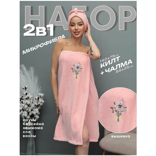 Набор полотенец для бани и сауны из микрофибры килт с чалмой 140х80 , для душа, бассейна, сауны и пляжа , цвет розовый