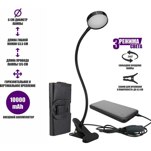 Гибкая настольная автономная лампа SL-06bd-PBК на прищепке c внешним аккумулятором в чехле 5.5"